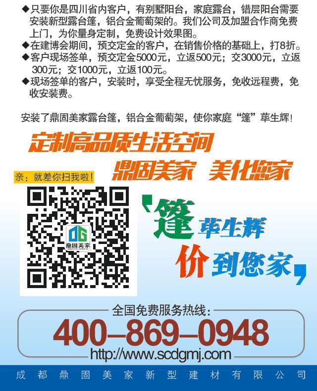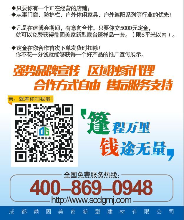 7月23日,第十五屆西南地區(qū)**大的建材博覽會,將在華陽新國際會展中心開幕了。這一次,鼎固美家精心準備。在博覽會期間,推廣新型產(chǎn)品。還向全國代理商,成都市場別墅家庭陽臺提出兩項優(yōu)惠推廣計劃:“篷”蓽生輝!價到您家!“篷”程萬里!“錢”途無量!